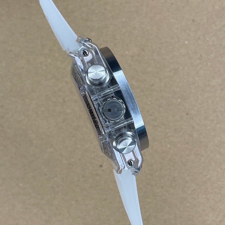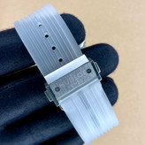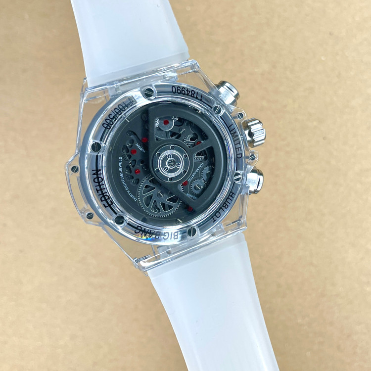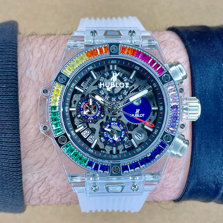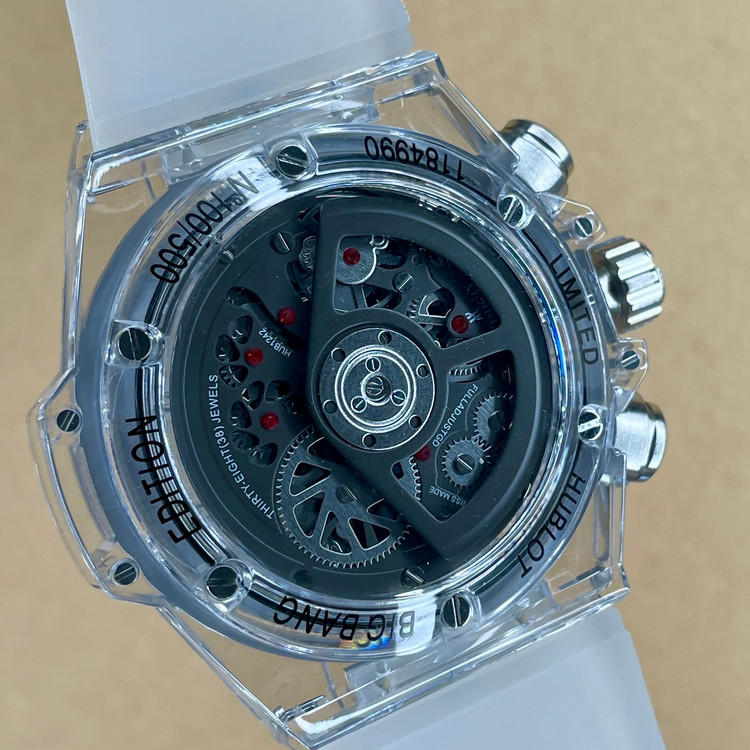 این ساعت با قابلیت ست شدن با انواع استایلها اسپرت و روزمره، میتواند همراه همیشگی شما در مهمانیها، دورهمیها و فعالیتهای روزمره باشد. روی صفحه این ساعت اسکلتون جزئیات موومنت قابل مشاهده است که جذابیت این ساعت رو بیشتر میکند. موومنت این مدل از سری بیگ بنگ هابلوت کوارتز بوده و دارای نمیشگر تاریخ و اندازه گیری بخشی از زمان با ویژگی کرنوگراف است.