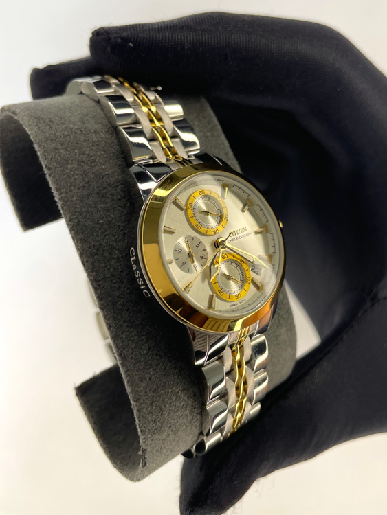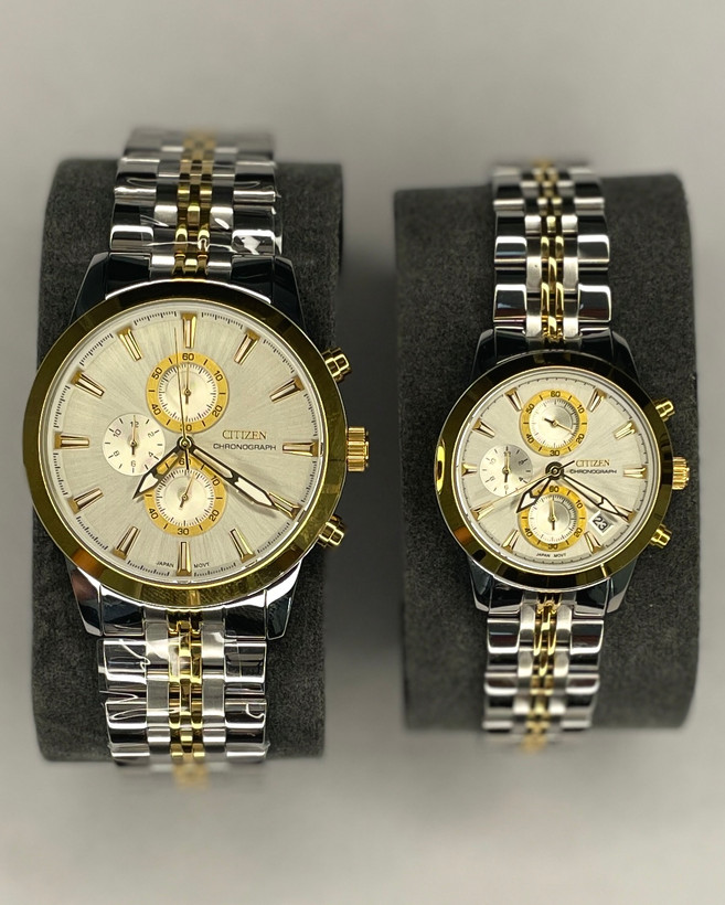ساعت مچی عقربه ای ست زنانه و مردانه سیتیزن کد 106 بی شک جزو شیک ترین و خاص ترین ساعت های مچی عقربه ای ست می باشد. این ساعت مچی عقربه ای ست زنانه و مردانه سیتیزن بدلیل ترکیب رنگ های خاص و زیبا نظر هر مخاطبی را به جلب میکند. جنس بند و قاب این ساعت ست استیل درجه 1 آنتی آلرژی بوده و دارای 3 موتور فعال کزنومتردار و از برند ژاپنی میوتا می باشد.