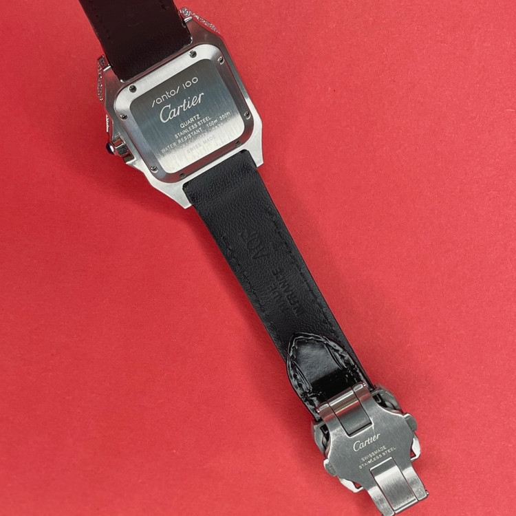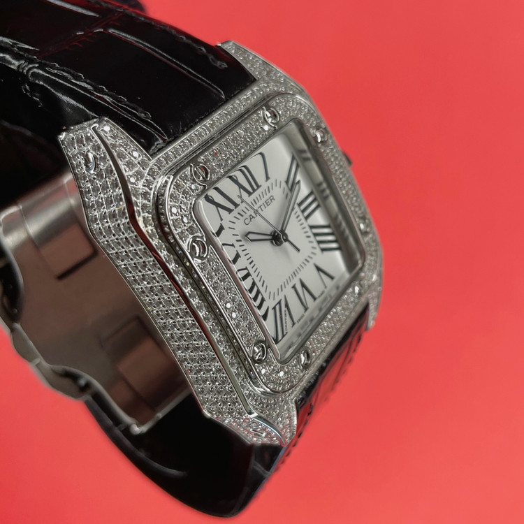 این ساعت مچی کلاسیک از سری Santos کارتیه یک نسخه هایکپی بسیار با کیفیت است که با طراحی مربعی شکل، پوشش قاب توسط نگین مخراج کاری شده و بند چرمی مشکی، انتخابی مناسب برای استفاده در مهمانی ها و مکانهای رسمی و روزمره است. صفحه سفید با اعداد رومی و عقربههای سفید رنگ، نشان دهنده طراحی سنتی کارتیه میباشد که همچنان محبوبیت خود را حفظ کرده.