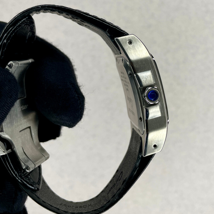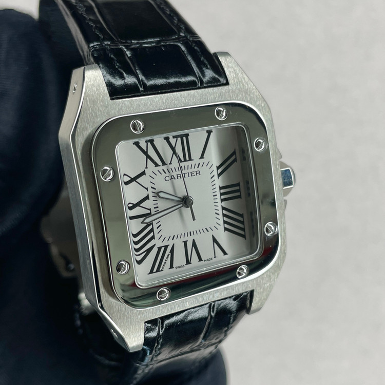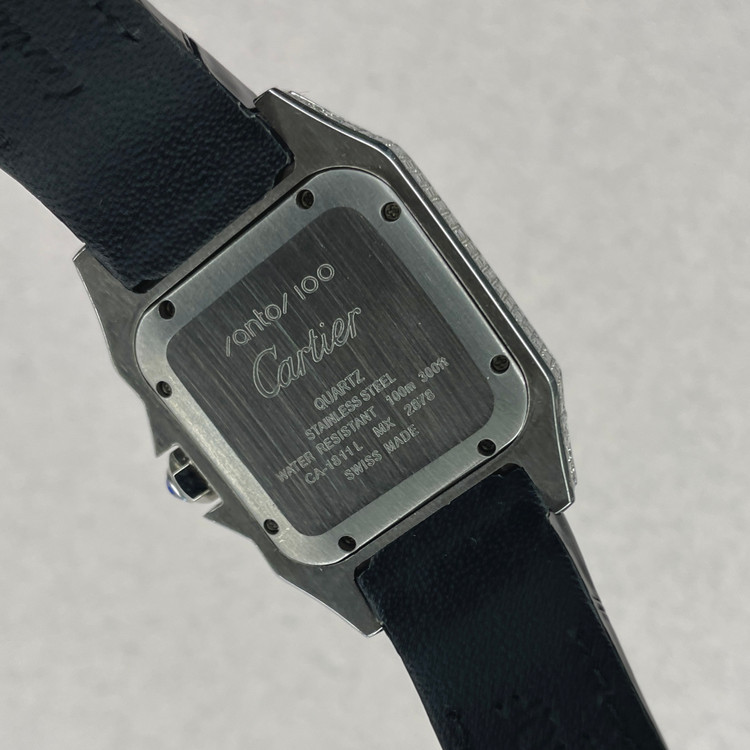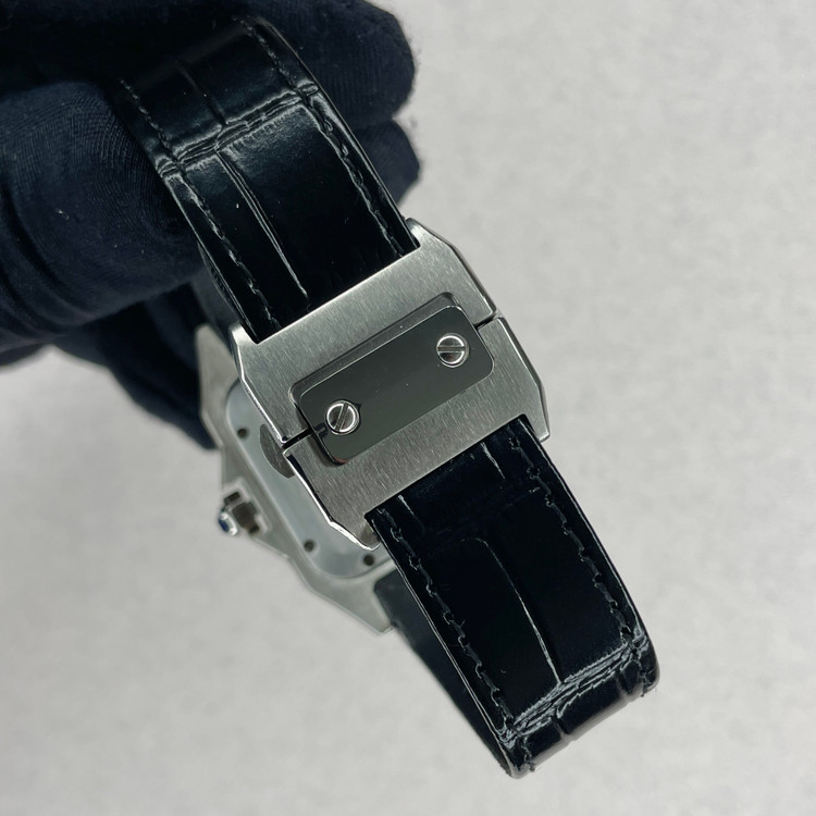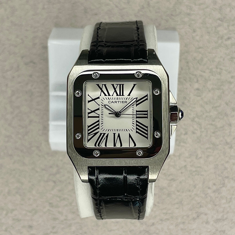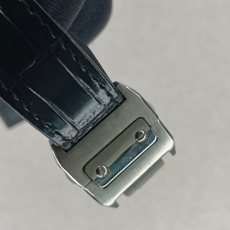 این ساعت مچی کلاسیک از سری Santos کارتیه یک نسخه هایکپی بسیار با کیفیت است که با طراحی مربعی شکل، ترکیب قاب مات و براق و بند چرمی مشکی، انتخابی مناسب برای استفاده در مهمانی ها و مکانهای رسمی و روزمره است. صفحه سفید با اعداد رومی و عقربههای سفید رنگ، نشان دهنده طراحی سنتی کارتیه میباشد که همچنان محبوبیت خود را حفظ کرده.