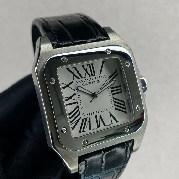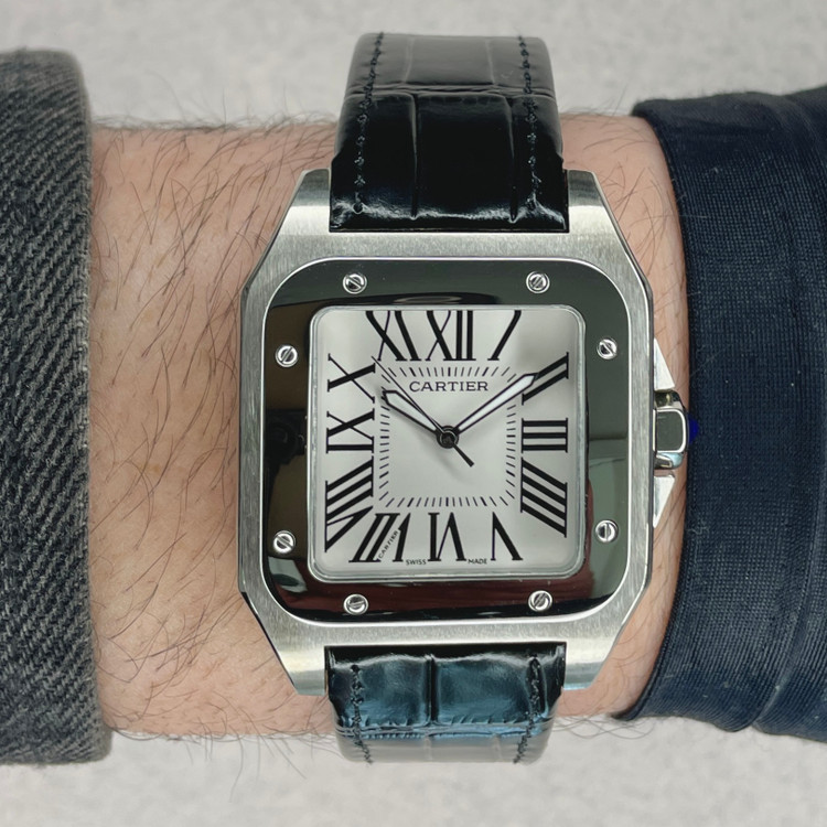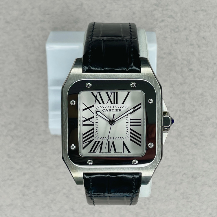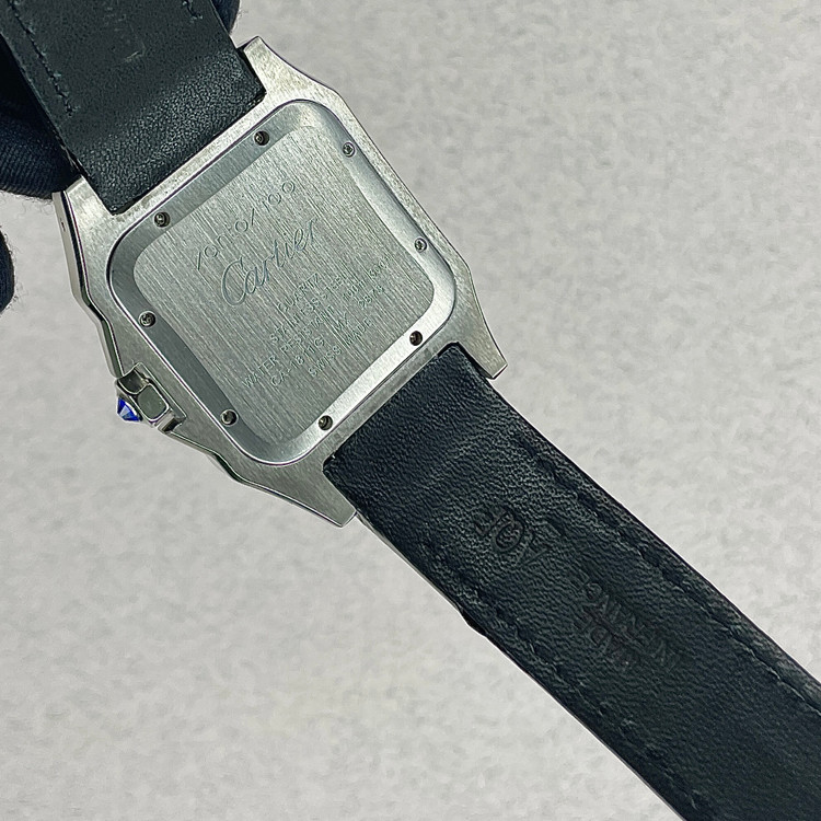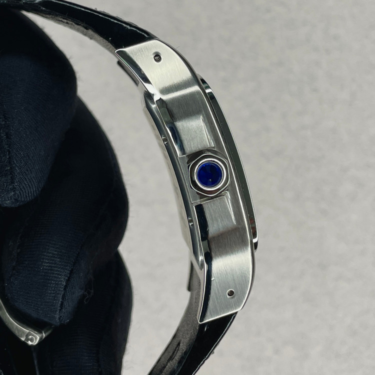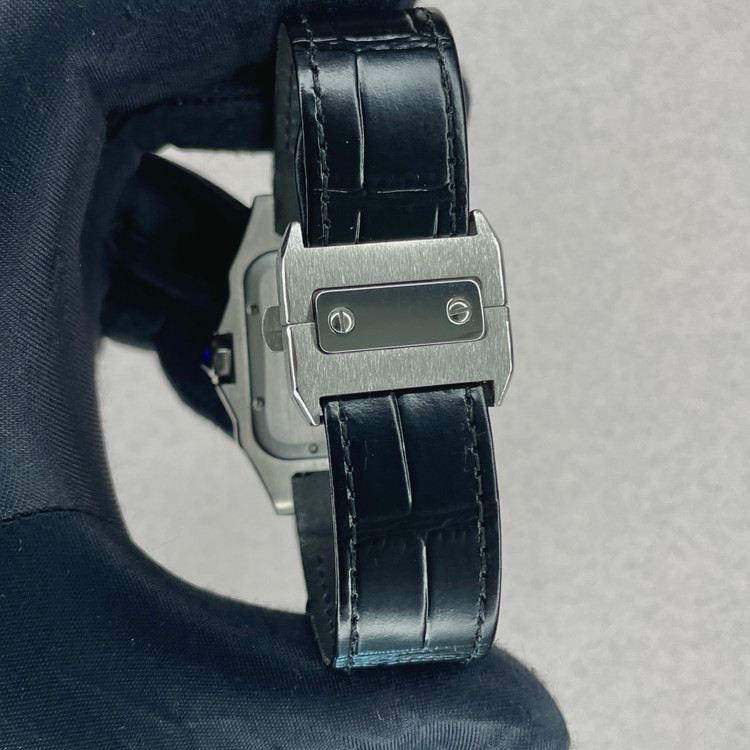 این ساعت مچی کلاسیک از سری Santos کارتیه یک نسخه هایکپی بسیار با کیفیت است که با طراحی مربعی شکل، ترکیب قاب مات و براق و بند چرمی مشکی، انتخابی مناسب برای استفاده در مهمانی ها و مکانهای رسمی و روزمره است. صفحه سفید با اعداد رومی و عقربههای سفید رنگ، نشان دهنده طراحی سنتی کارتیه میباشد که همچنان محبوبیت خود را حفظ کرده.
