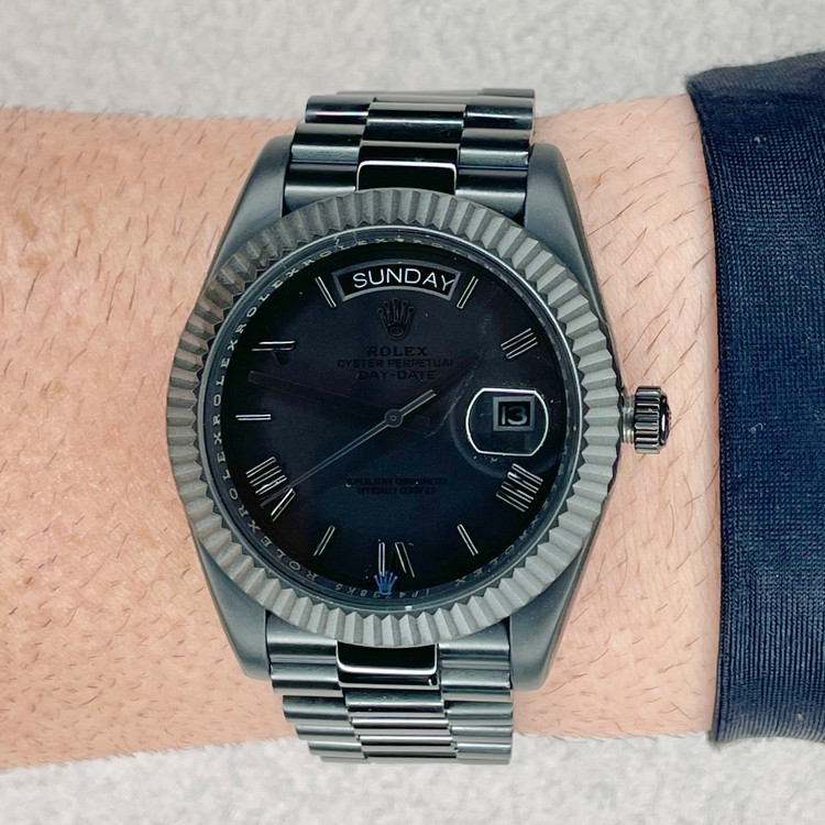 صفحه مشکی مات با نشانگرهای رومی و عقربههای مشکی، هماهنگی زیبایی ایجاد کرده است. دستبند پرزیدنت سه تکه، از ویژگیهای شاخص این مدل میباشد. نمایشگر روز هفته و تاریخ با پنجره آبی رنگ در موقعیت 3، کاربرد روزمره را افزایش داده است.