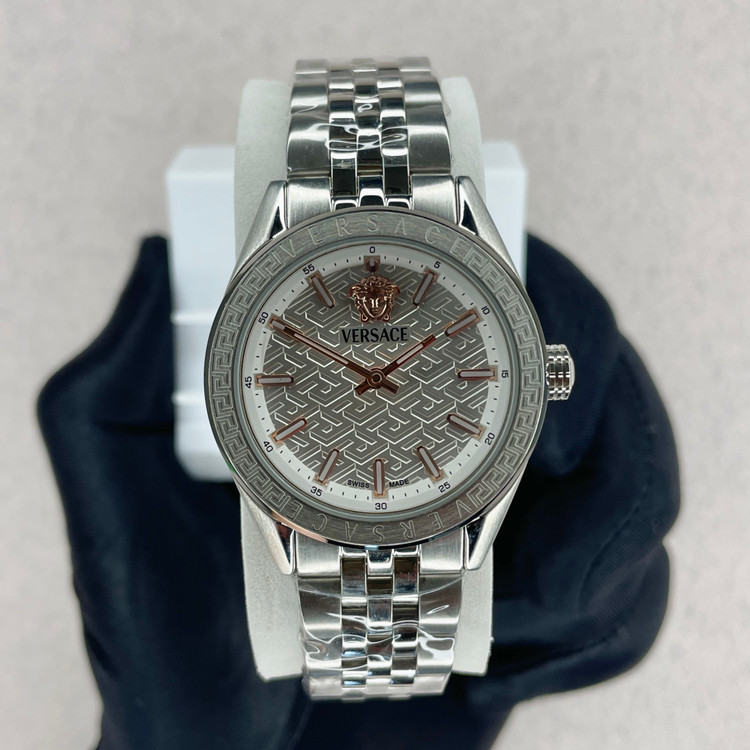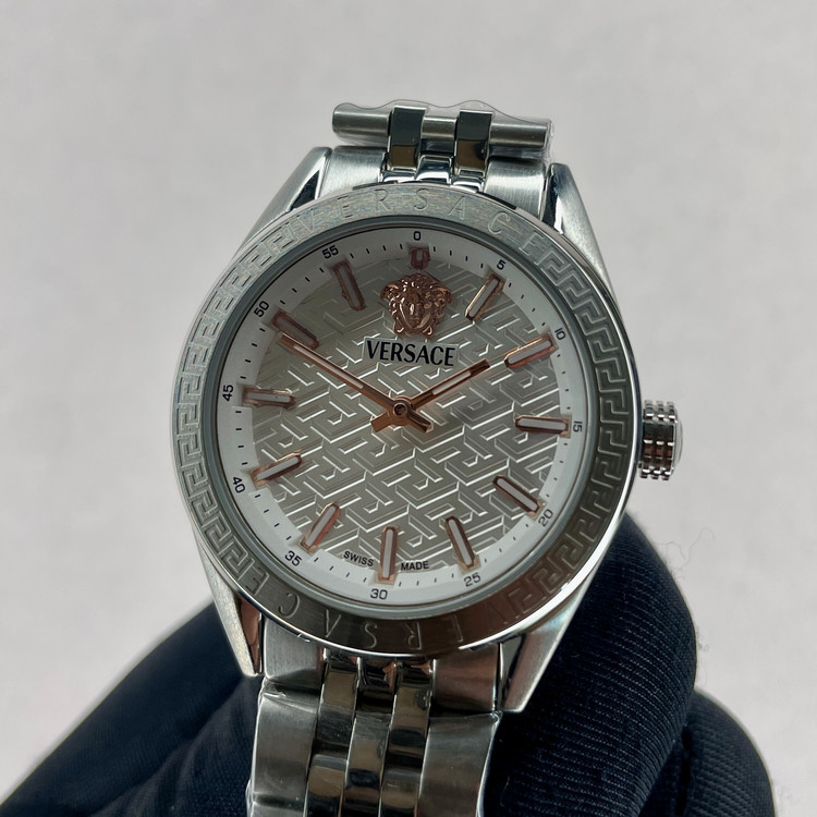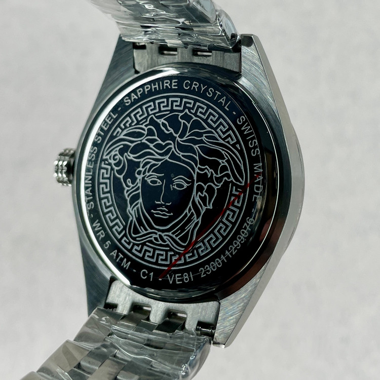 ترکیبی از طراحی جسورانه و کیفیت ساخت است. این مدل با صفحهی استخوانی و الگوی هندسی پیچیده، فوراً نگاهها را به خود جلب میکند. لوگوی معروف سر مدوسا در بالای صفحه، امضای اصالت و سبک منحصربهفرد ورساچه را نشان میدهد.