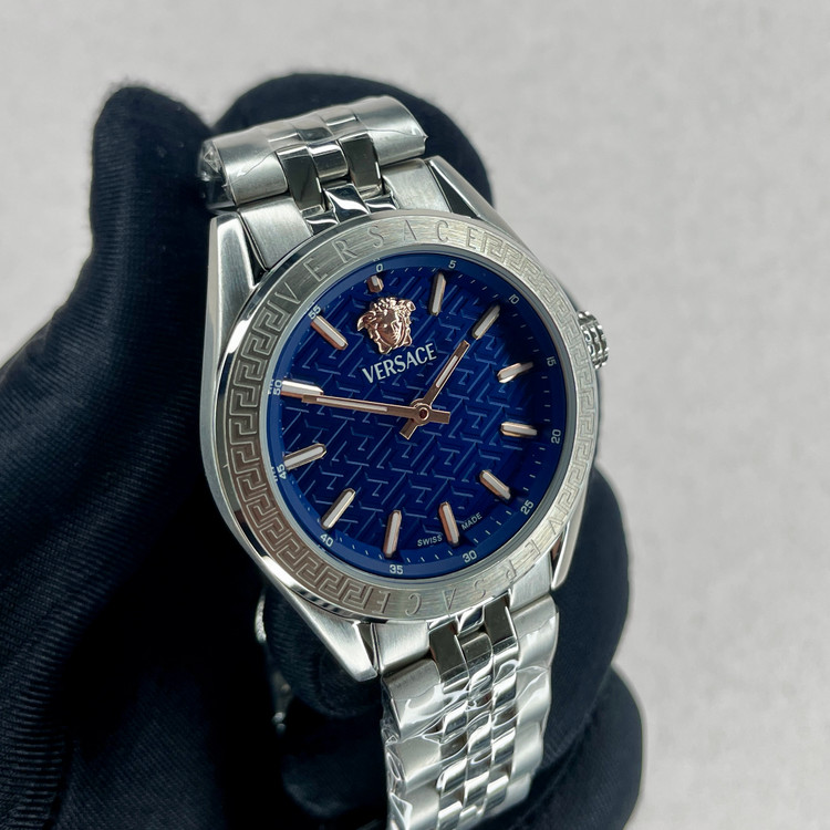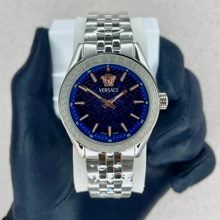 ترکیبی از طراحی جسورانه و کیفیت ساخت است. این مدل با صفحهی آبی نفتی و الگوی هندسی پیچیده، فوراً نگاهها را به خود جلب میکند. لوگوی معروف سر مدوسا در بالای صفحه، امضای اصالت و سبک منحصربهفرد ورساچه را نشان میدهد.