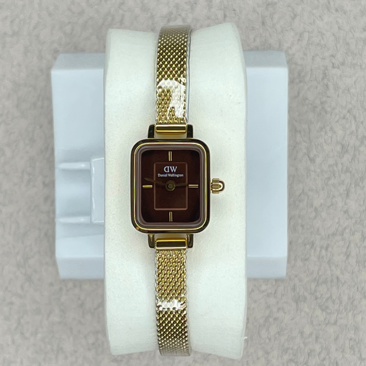 ساعت زنانه دنیل ولینگتون مستطیلی بندحصیری طلایی صفحه قهوه ای