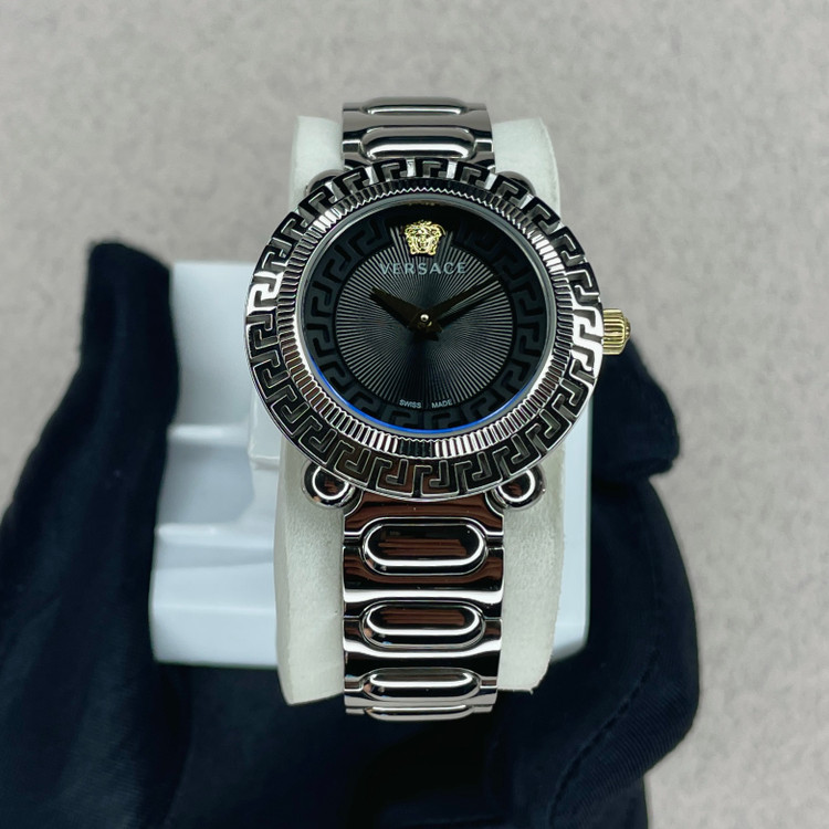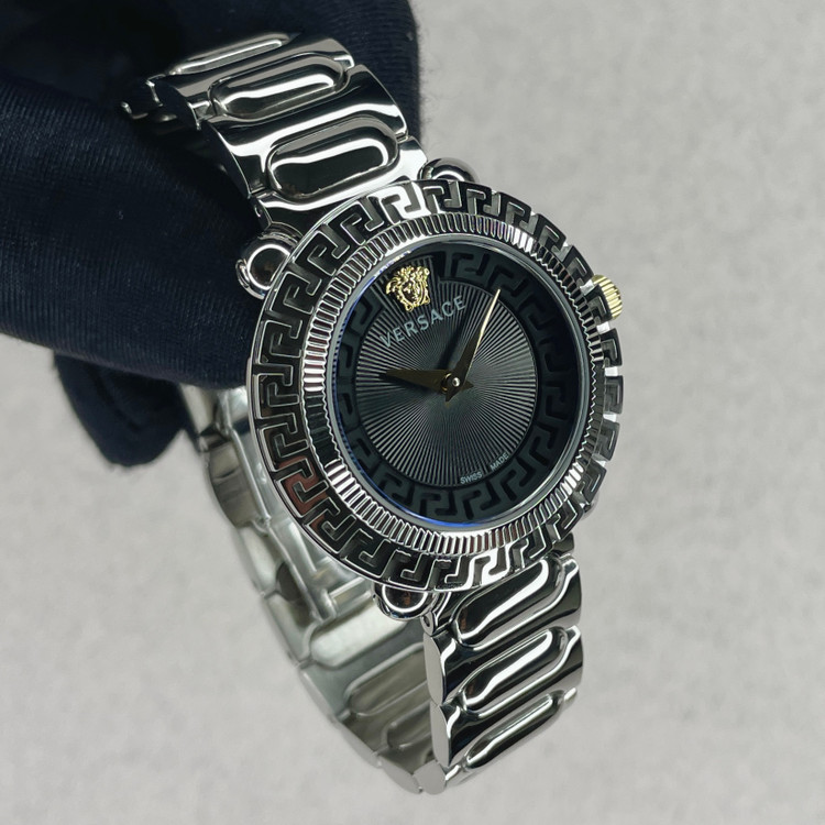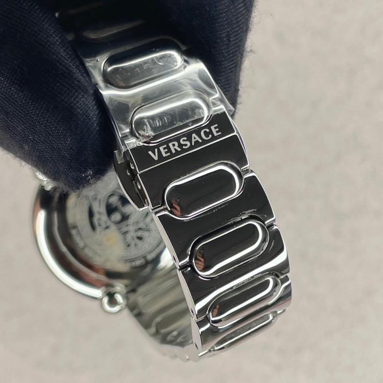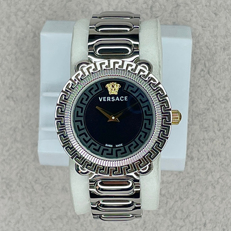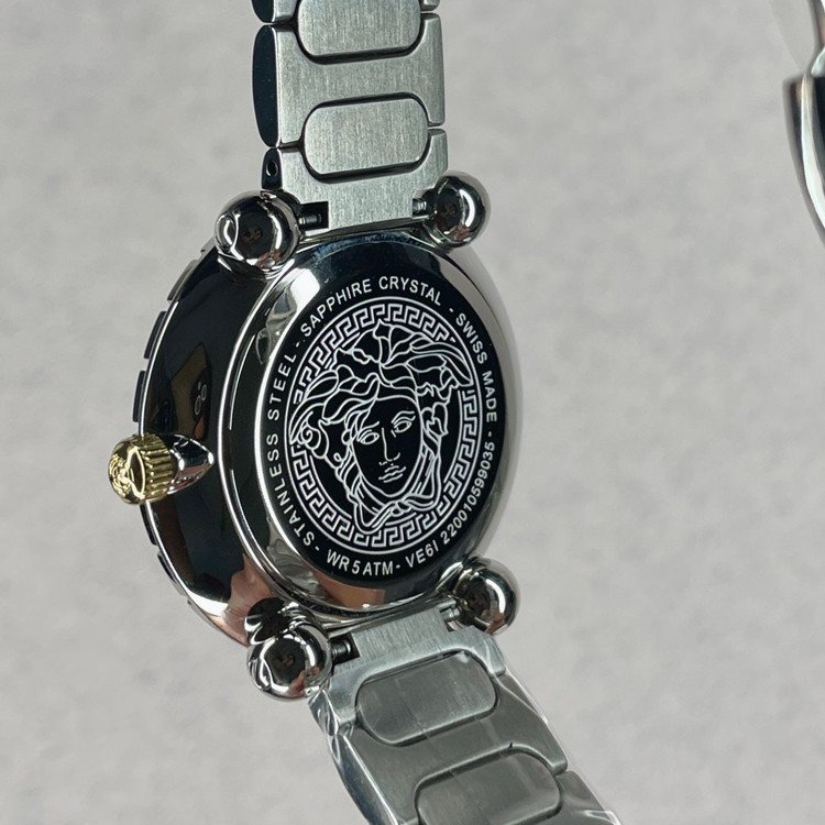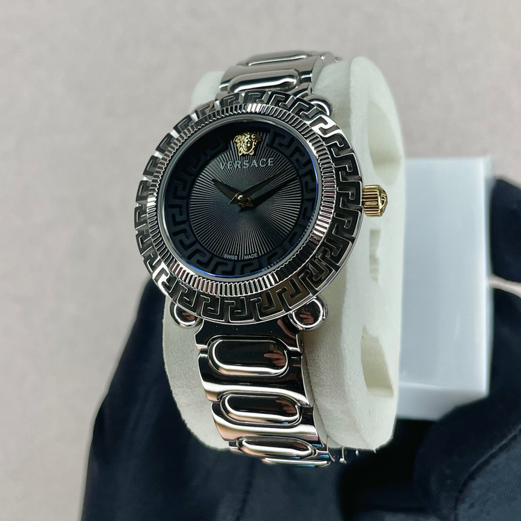 ترکیبی از طراحی جسورانه و کیفیت ساخت است. این مدل با صفحهی مشکی و الگوی هندسی پیچیده، فوراً نگاهها را به خود جلب میکند. لوگوی معروف سر مدوسا در بالای صفحه، امضای اصالت و سبک منحصربهفرد ورساچه را نشان میدهد.