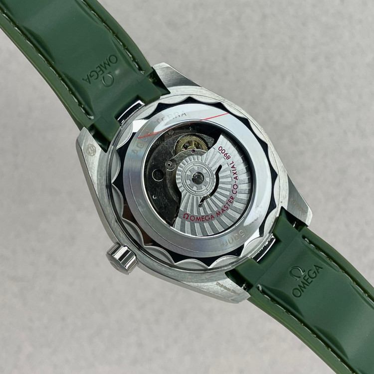از مهمترین عناصر طراحی متمایز آکوا ترا، عقربه دقیقه شمار با نوک فلش، علاوه بر ایندکس های مخروطی ساعت است همچنین بند رابر سبز رنگ هارمونی زیبا و خاصی به وجود اورده که یکی از بهترین طراحی هاست.