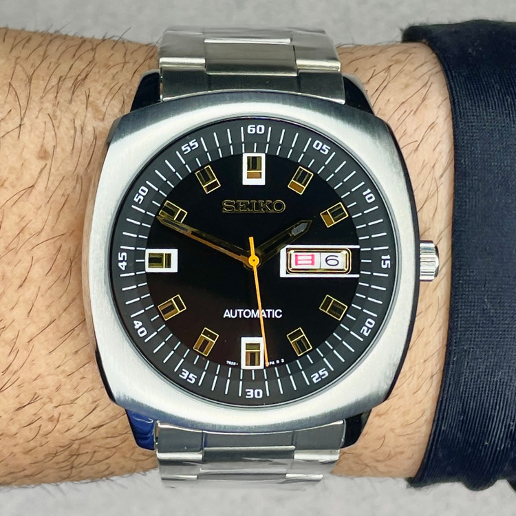 ساعتی متفاوت با قاب مربعی-گرد و صفحه مشکی رنگ که ایندکس و عقربه های طلایی به زیبایی آن افزوده است.