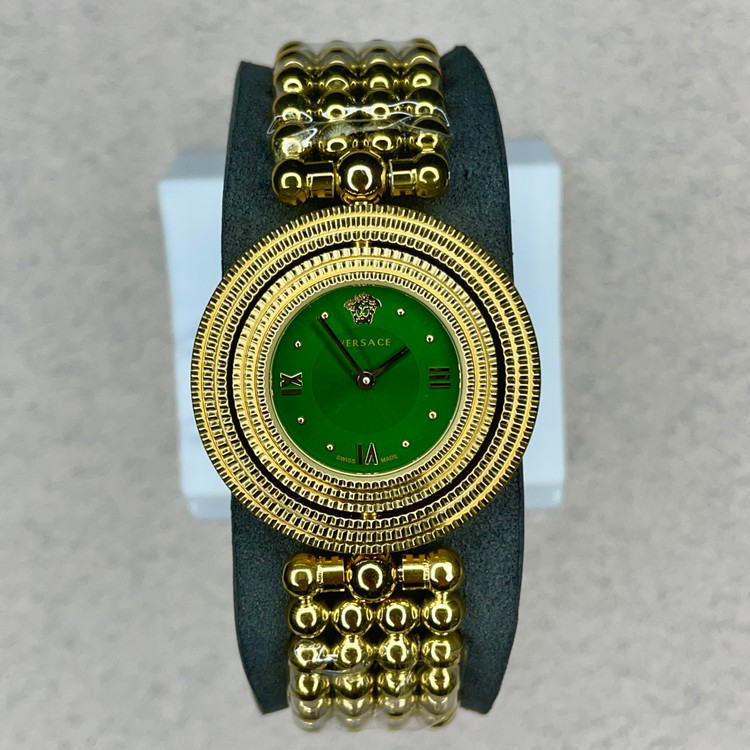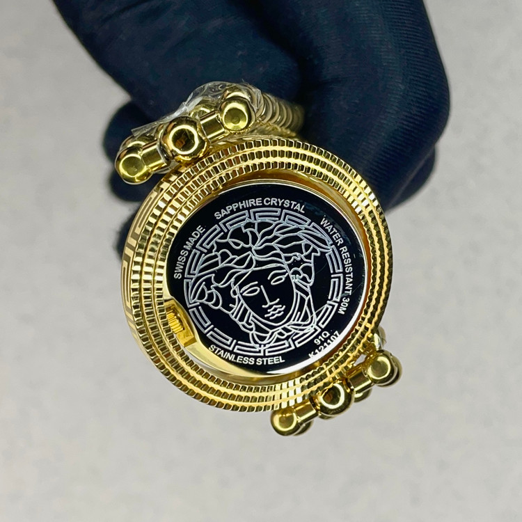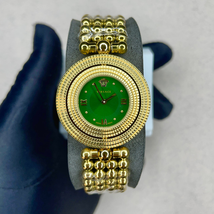 ترکیبی از طراحی جسورانه و کیفیت ساخت است. این مدل با صفحهی سبز ودو رینگ دور قاب با بدنه و بند طلایی، درهر مهمانی و جمعی نگاهها را به خود جلب میکند. لوگوی معروف سر مدوسا در بالای صفحه، امضای اصالت و سبک منحصربهفرد ورساچه را نشان میدهد.