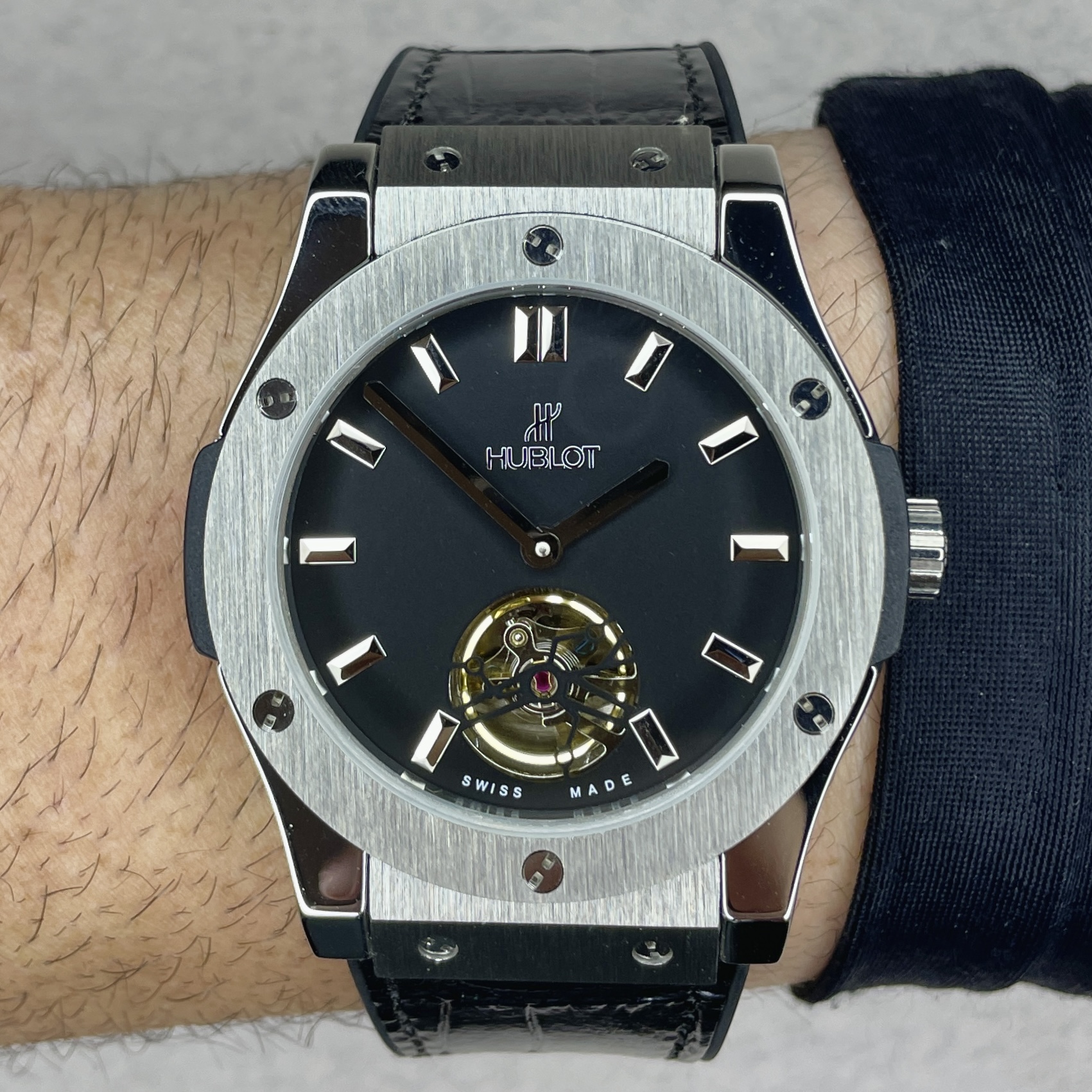 ساعت ارائهشده یکی از مدلهای خاص برند معتبر Hublot از سری Classic Fusion است؛ سریای که با ترکیب طراحی مدرن، کیفیت ساخت سوئیسی و موتوری دقیق که کارکرد آن از دریچه طراحی شده در صفحه و چنین پشت ساعت قابل مشاهده بوده، جایگاه ویژهای در میان ساعتهای لوکس دارد.