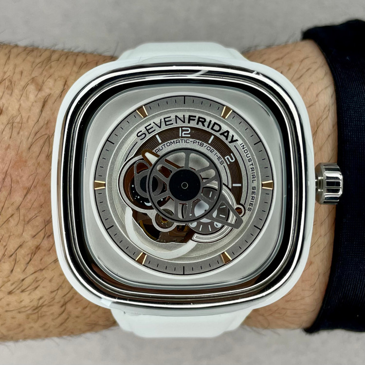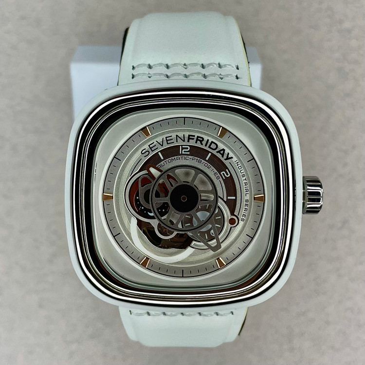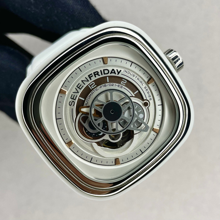 هایلایتهای طلایی روی صفحه دقیقهشمار و عقربه ساعتشمار و یک لوگوی مشکی SEVENFRIDAY بالای علامت ۱۲H، رابط چندلایه را تکمیل میکنند.