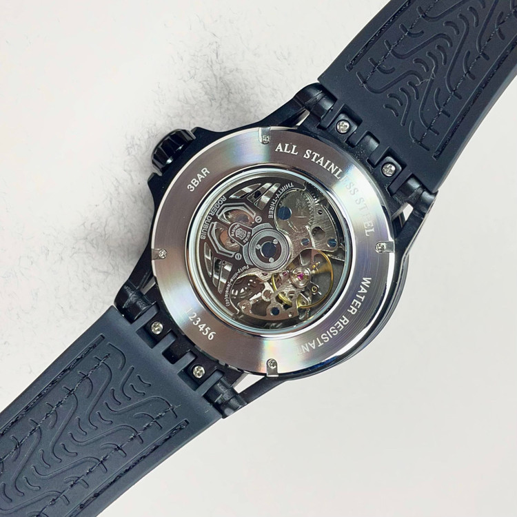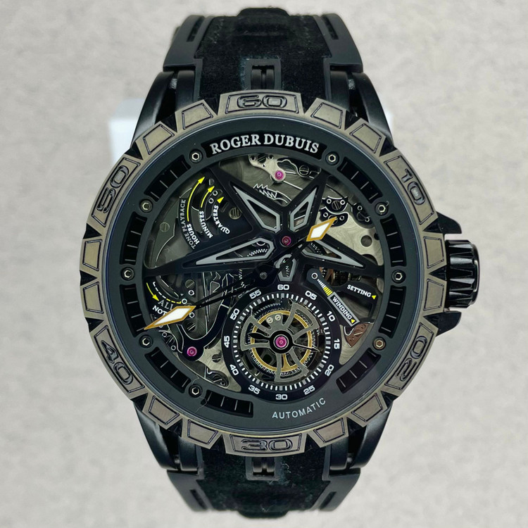 ساعت کپی Roger Dubuis با طراحی جسورانه و کاملاً اسپرت، انتخابی ایدهآل برای افرادی است که به ساعتهای خاص، متفاوت و لوکس علاقهمند هستند. این مدل با صفحه اسکلتون (Skeleton Dial)، نمایی چشمنواز از اجزای داخلی موتور را به نمایش میگذارد و حس یک ساعت حرفهای و مدرن را منتقل میکند.