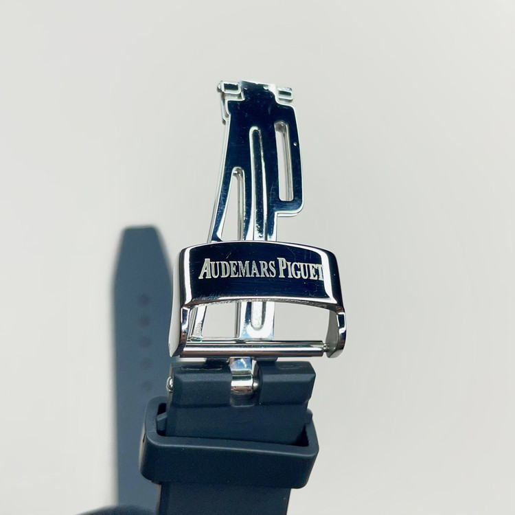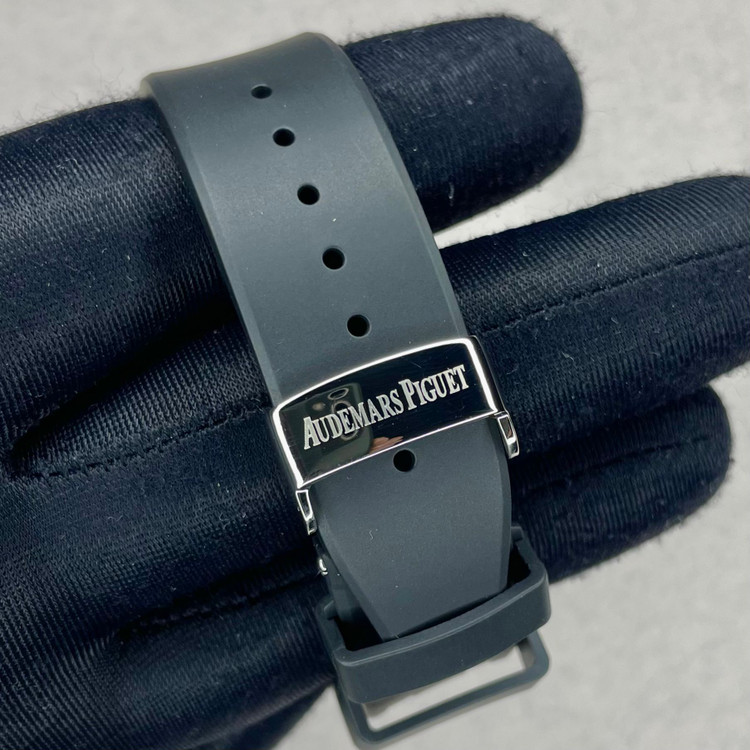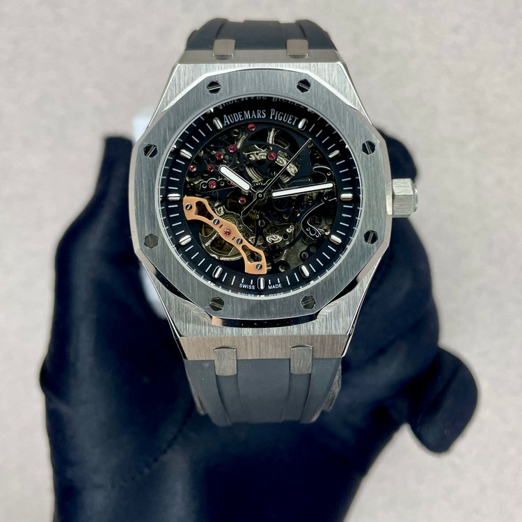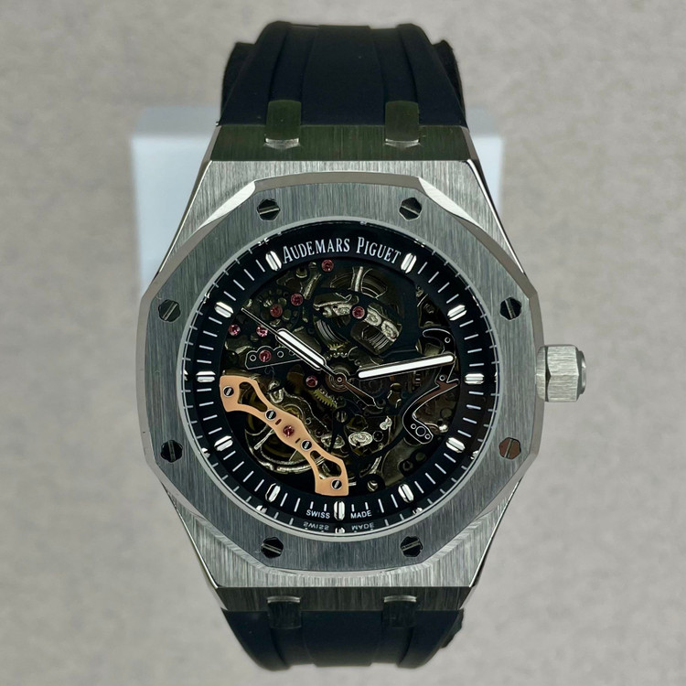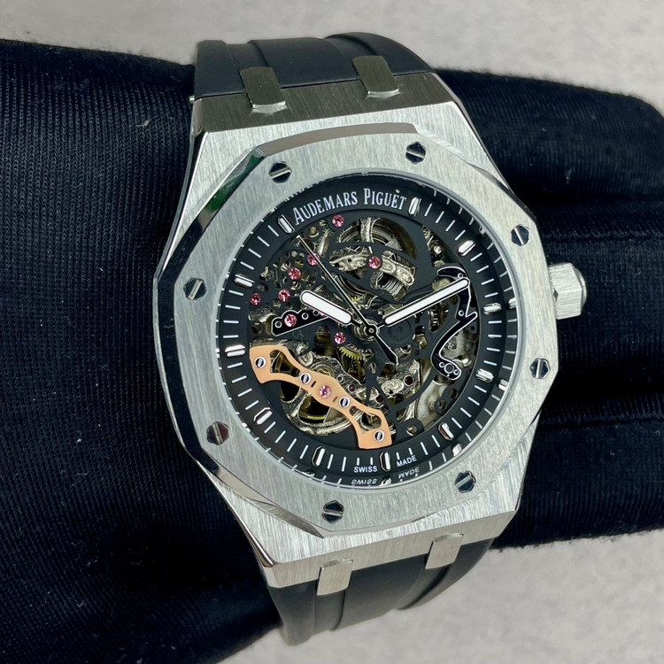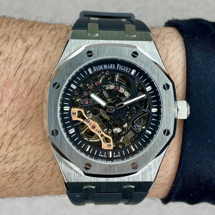 ساعت Royal Oak Double Balance Wheel با رویه باز، در تضاد با قاب استیل ضد زنگ، موتور باز با رنگ صورتی-طلایی و قاب داخلی هماهنگ، ظاهری دو رنگ و مدرن به آن بخشیده است. پیچهای طلایی صورتی روی قاب، جلوهای خاص به آن بخشیدهاند.